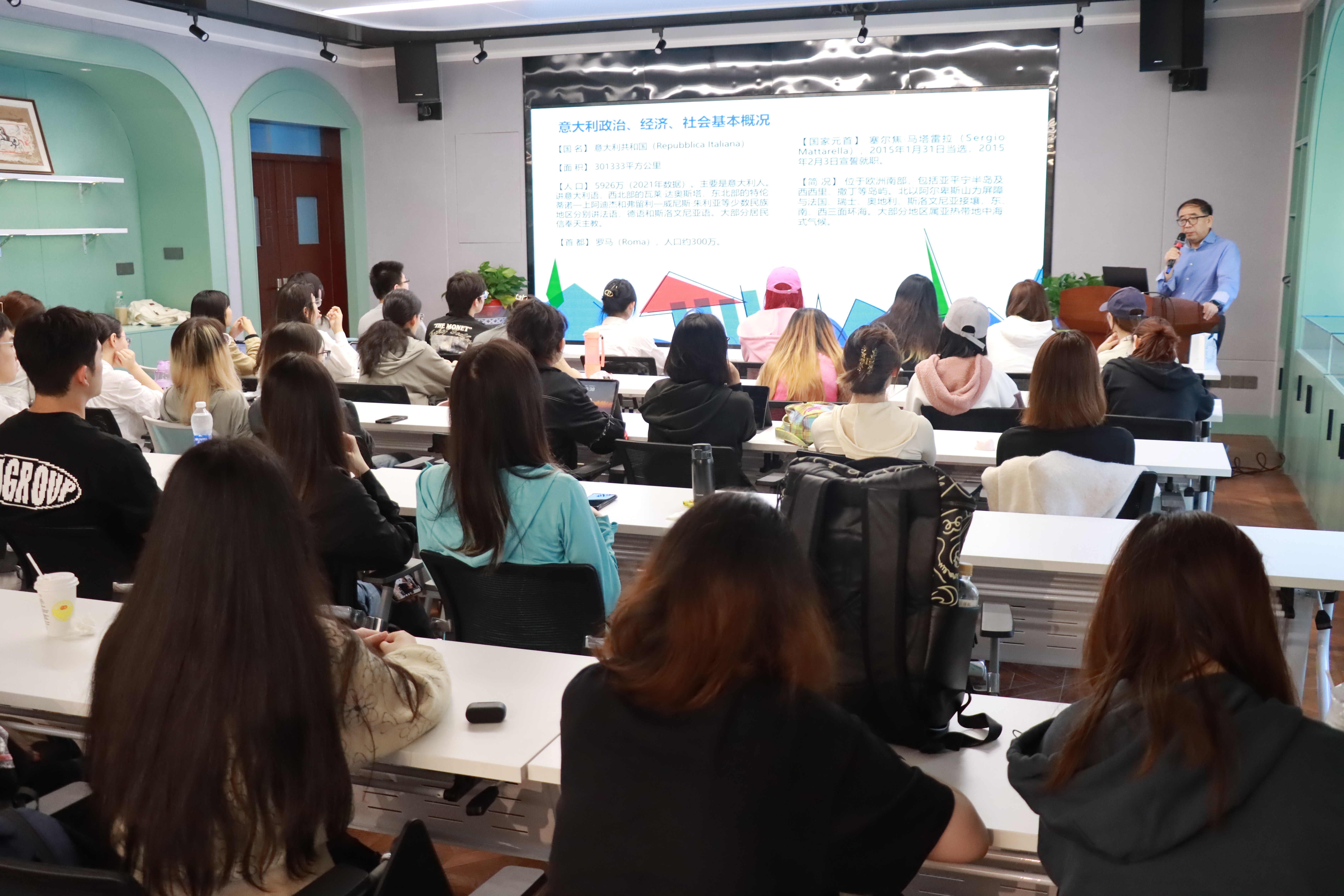 邢老师为同学们介绍了意大利高等教育体系、中意高等教育交流与合作、意大利大学的教学、组织,学习与授课方式等内容,他指出,中意两国大学的科学研究合作日益增长,尤其是高水平人才培养和文化遗产保护领域合作频繁。对于同学们如何在意大利留学期间获取更多的知识,邢老师强调:首先,留学是锻炼语言学习的好机会,要打开自己的生活圈,不要封闭自己。其次,要怀有一颗“好奇心”,积极主动地探索新生活。第三,邢老师建议同学们勤写日记,多观察、多比较,记录生活中的点滴。