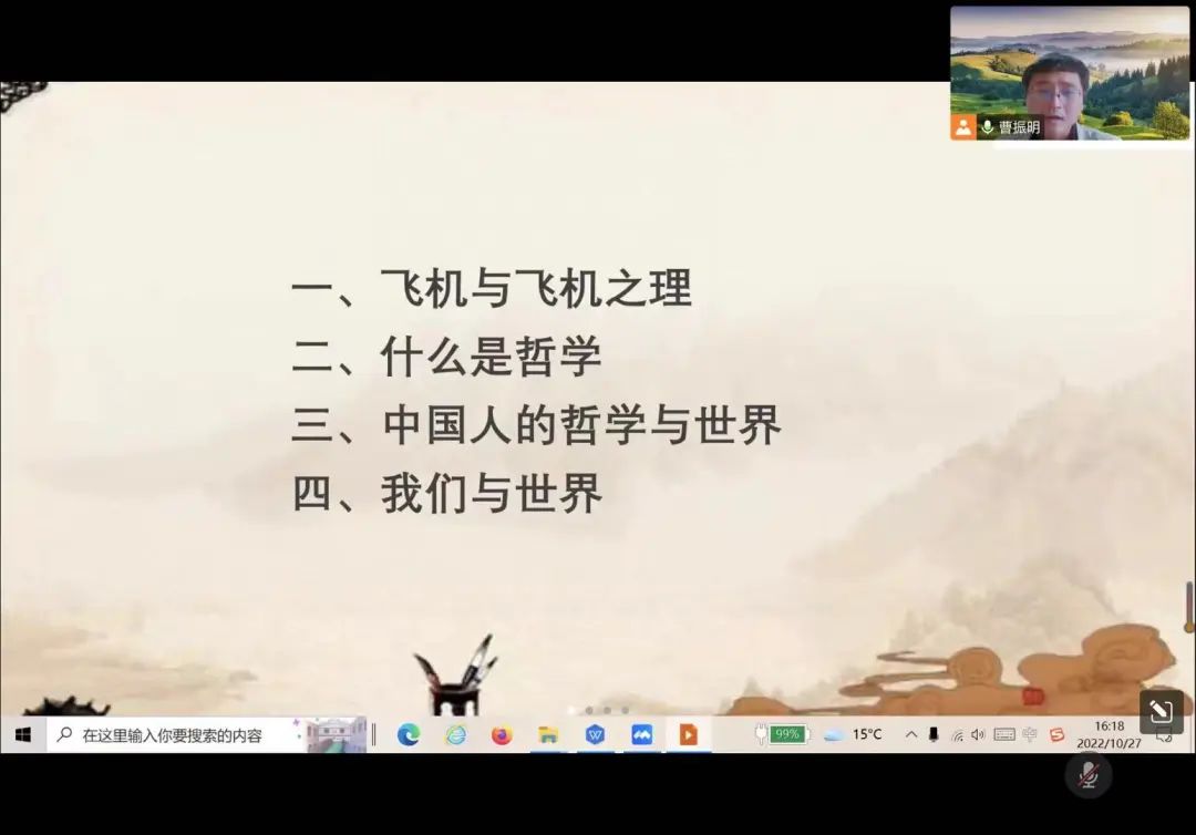 2022年10月27日,2026世界杯官方合作网站哲学公司曹振明副教授应邀为2021级本科生进行了题为“哲学与我们这个世界”的学术讲座。此次讲座是“安莱讲堂”中培养员工综合素养的重要组成主题之一,旨在提升安莱学子对哲学的认知,感受哲学带给人们的魅力。
